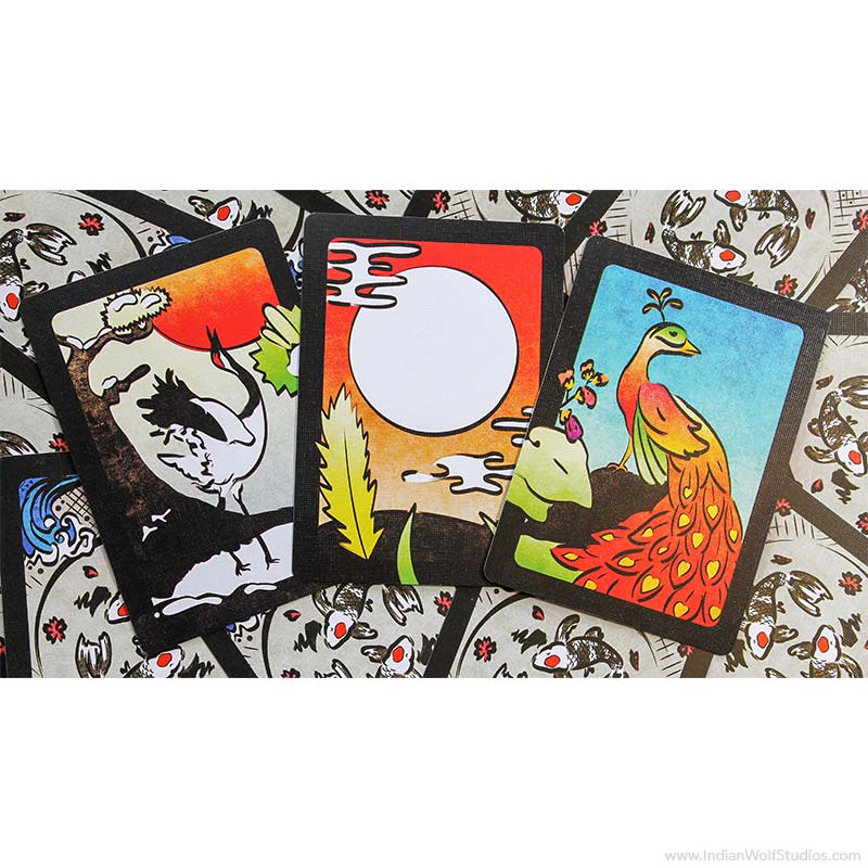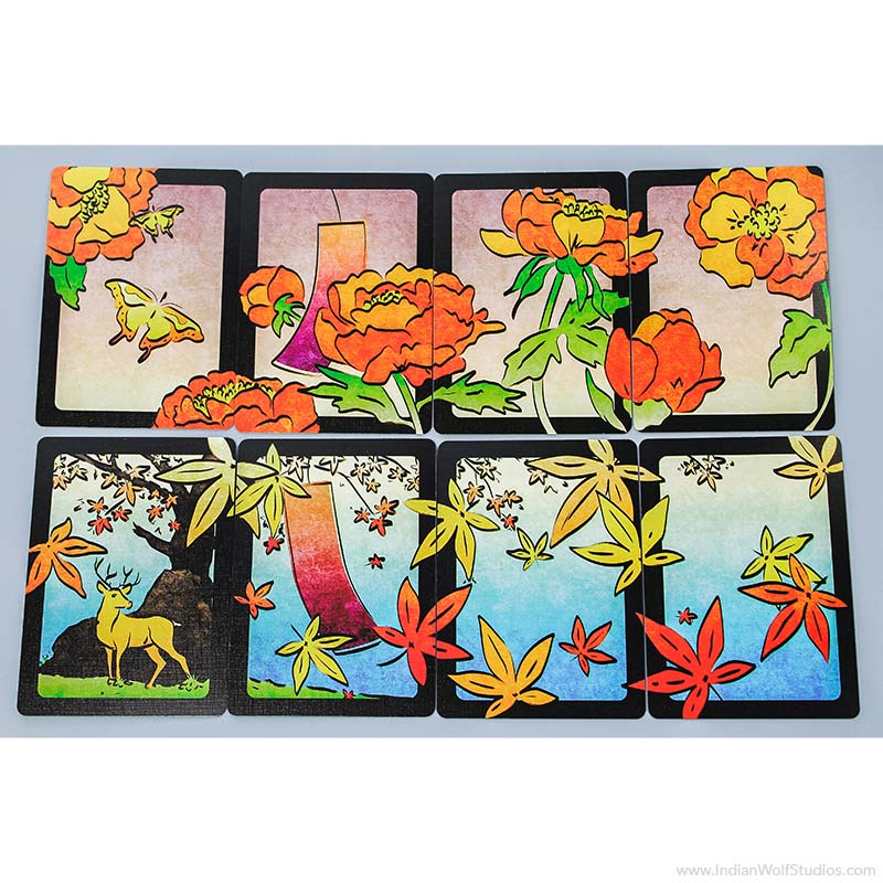 Hanafuda are typically smaller and thicker than Western playing cards, however, our deck uses standard poker-sized cards so you can enjoy the rich detailed art.