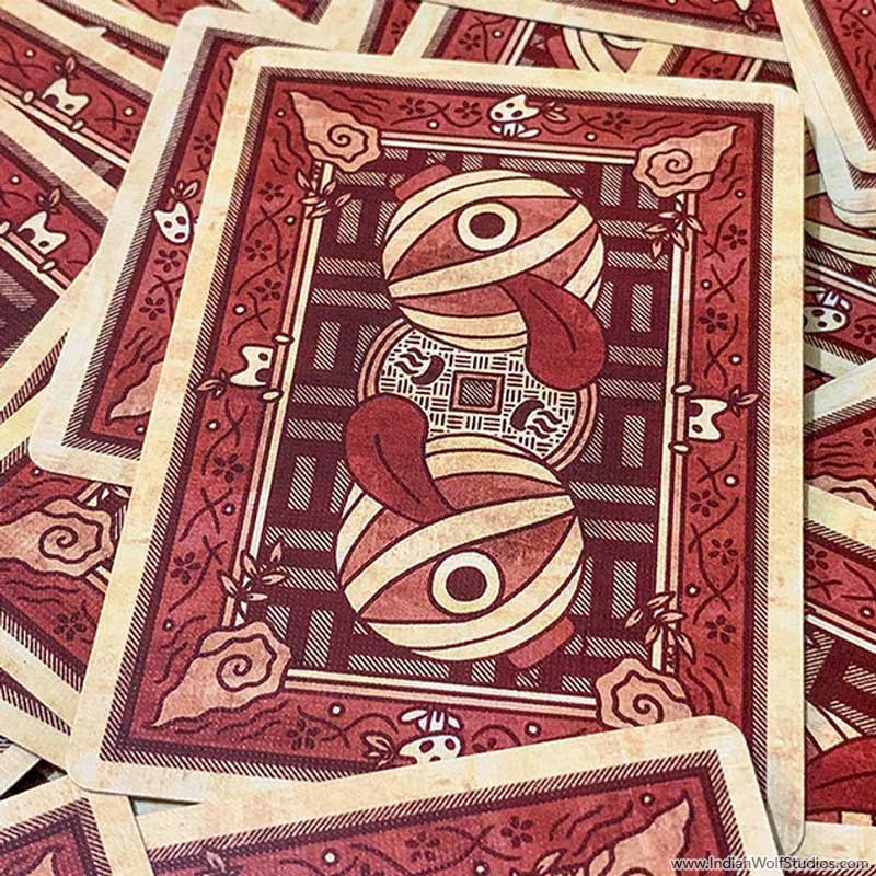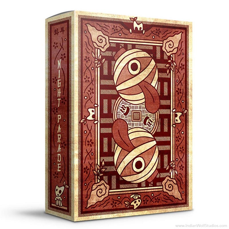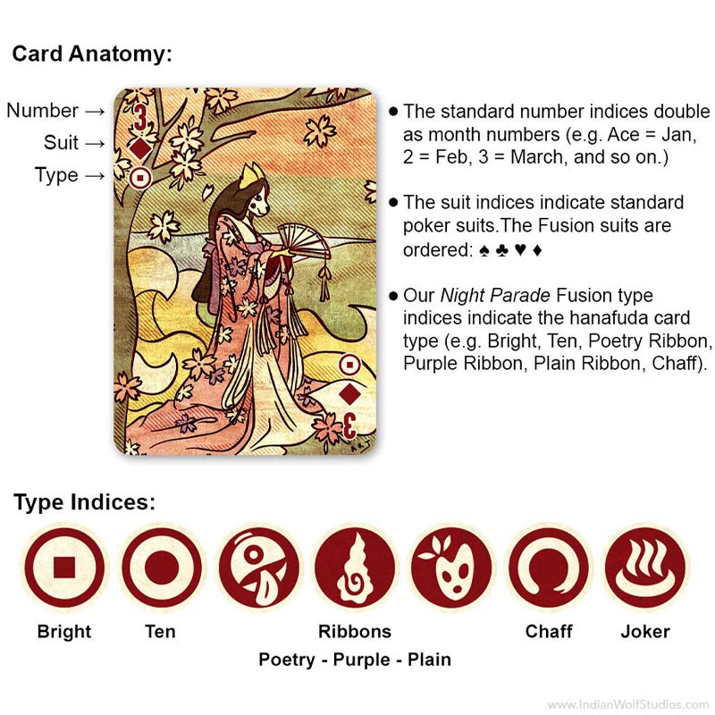 Our Night Parade Fusion deck combines standard poker indices, hanafuda imagery, and custom-designed hanafuda indices into a multipurpose deck that can be used to play both Eastern and Western games.