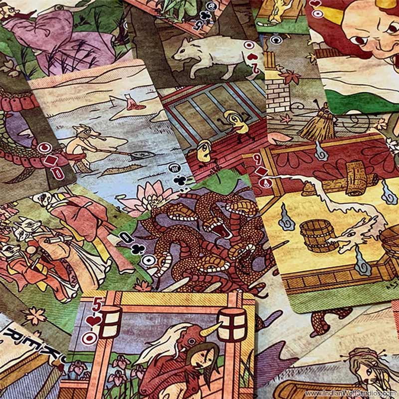 Hanafuda are typically smaller and thicker than Western playing cards, however, our deck uses standard poker-sized cards so you can enjoy the rich detailed art.