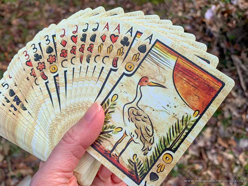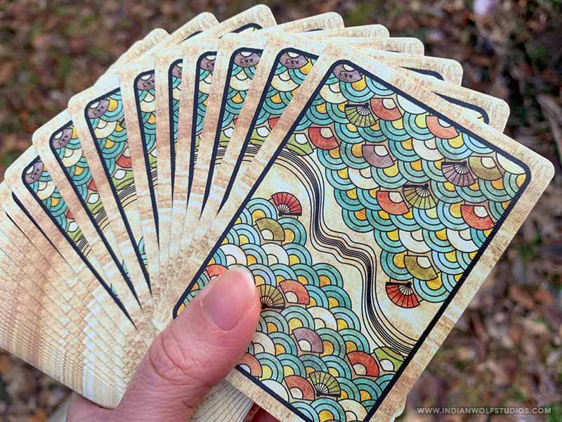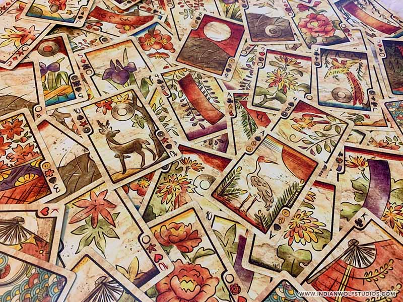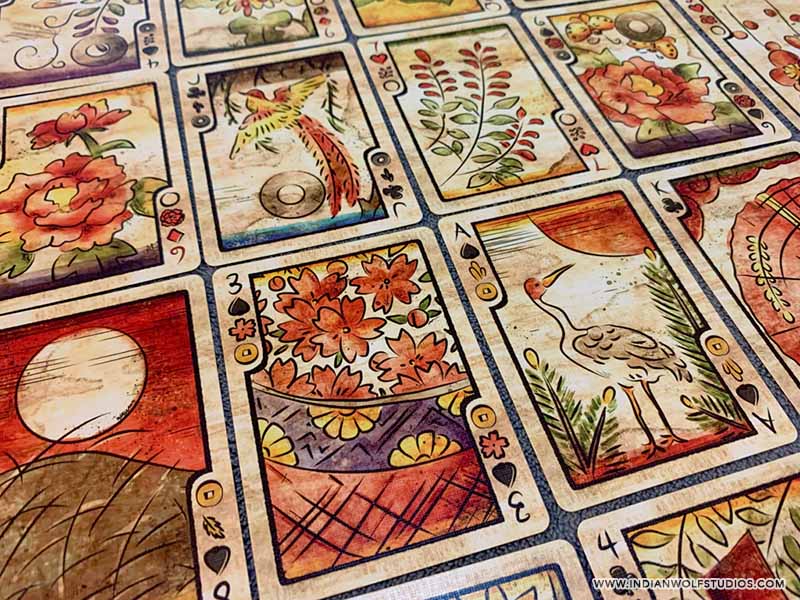 Hanafuda are typically smaller and thicker than Western playing cards, however, our deck uses standard poker-sized cards so you can enjoy the rich detailed art.